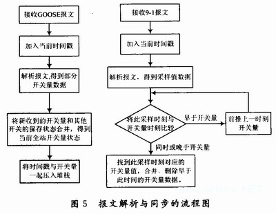 9-1数据来自合并单元,而开关量采样数据来自保护控制单元,两者的数据源不同,发送的报文格式也不同。IEC-61850中定义的GOOSE报文,每帧报文中含有详细的绝对时间,但报文只有在开关量发生变位时才发送,在开关量变位后,则建议按指数递增的时间间隔发送,因而接受到GOOSE报文的时刻是不定的。在某些实际应用中,甚至可能发生保护装置未进行同步,造成GOOSE报文中的时间戳不准的情况。另一方面,故障录波需要全站的大量开关量数据,而单一保护控制单元发送的GOOSE报文只包含其中的一部分,需要将不同来源的GOOSE报文进行同步和组合。包含模拟量采样值的9-1报文通过合并单元后虽然具有录波所需要的全部模拟采样值数据,也按照固定的采样频率均匀发送,但其中仅含有秒的等分序号,而没有绝对的时间信息。因此必须要将不同源的开关量之间、以及开关量和模拟量之间进行同步合并,对数据整体加入绝对时刻。在设计同步方案时,充分考虑到开关量的数据更新频率远远小于开关量数据读取频率,即绝大多数的同步工作都是将保存的开关量与当前收到的模拟量采样值进行合并,只在低频率的GOOSE报文来临时才需要更新保存的开关量值。在该设计中,高频率的模拟量数据到需要和开关量合并时,保存开关量的堆栈中将只含有最近的一次或之前少数几次开关量状态,模拟量数据将以极大的概率直接与最近的开关量时间匹配,维护此堆栈的空间开销和时间开销都很小。具体流程图如图5所示。