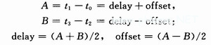 主、从时钟偏差(offset)以及网络延迟(delay)可表示为: