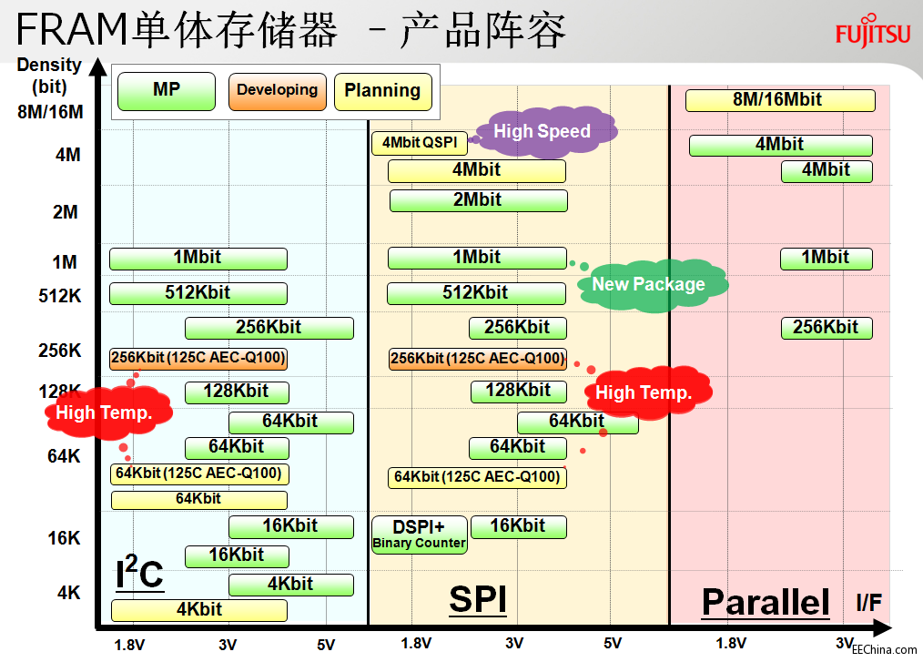 另外,蔡振宇在演讲时还特别强调,富士通半导体的FRAM与EEPROM封装相同,引脚也完全兼容,功能方面也具有兼容性,各种接口通用(I2C 、SPI 和并口),协议兼容,替代使用上没有任何障碍。