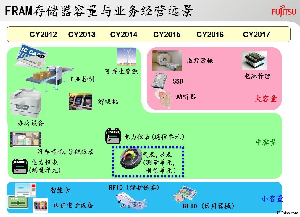 而FRAM的应用领域广泛,富士通FRAM过去几年在中国的智能卡、电力仪表(三相表和集中器)、工业控制、办公设备、汽车音响导航仪器、游戏机、RFID、医疗器械及医疗电子标签等等行业率先取得了可喜的成绩,得到大批量应用。如下图所示,富士通半导体的FRAM进入水、气表市场领域已近两年,那么进展情况如何呢?据蔡振宇介绍,虽说整体经济环境比较疲软,但并没有阻止水表气表的智能化进程,对FRAM需求增长平稳,富士通FRAM在这领域的营收增长达到了30%。
