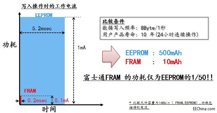 如上图所示,在相同的条件下(元件容量为16Kbit,功耗包括待机电流),采用EEPROM 耗电量高达500mAh,而采用FRAM的耗电量仅10mAh,后者仅为前者的1/50!