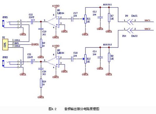 音频输出部分:主要是将SPCE061A两路音频输出端通过LM386放大,经喇叭播放。