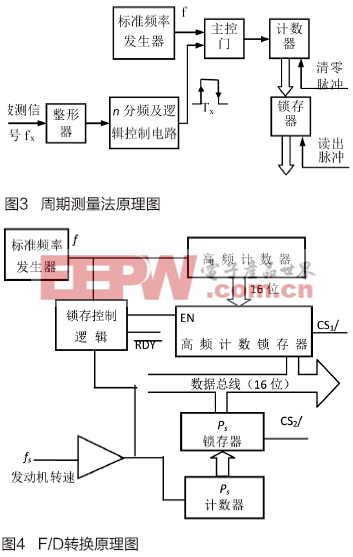 在工作过程中,单片机AT89S51采用中断方式工作,每隔35ms中断一次,在中断间隔内完成大部分输入/输出任务。CPU响应中断后经双向数据总线向输入接口组件发出一个口地址信号,选通输入的频率信号。待锁存控制逻辑发出准备好信号时,CPU通过发送口地址信号取走对应的计数值,再解算出发动机的转速。