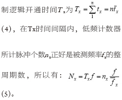 门控信号Tx的上升沿打开主控门,使计数器开始对标准频率发生器发出的高频标准频率脉冲f进行计数,Tx下降沿关闭主控门,计数器停止计数。这时,计数器的计数值Nx为:Nx = Tx f(2),将式(1)代入式(2),可得: