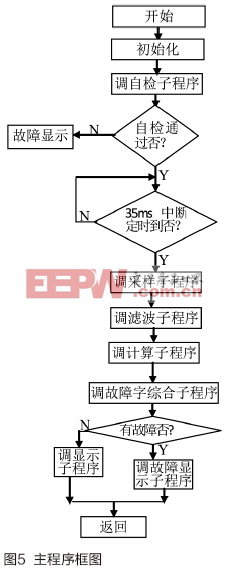 主程序框图如图5所示。主程序采用中断方式工作,主中断每35ms发生一次,即一个程序周期,主要完成被测转速所对应的频率信号的采集,对这些采样值进行滤波,调用计算子程序计算出发动机转速,输送给显示装置,同时完成系统的自检。