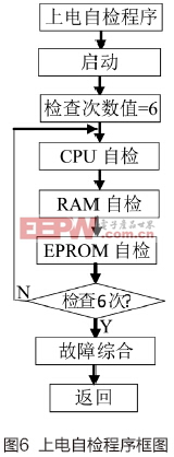 自检程序是提高高度表的可靠性和可维护性的手段之一,它主要针对系统的软、硬件进行测试,及时发现故障送出告警信号。它具有对偶然故障进行过滤的功能,当故障清除后,系统可自动恢复。上电自检子程序框图如图6所示。