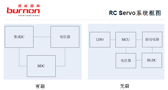 RC Servo,通常称之为舵机。一般分有刷与无刷两种,其取决于电机是使用BLDC还是BDC。有刷RC Servo使用集成IC控制系统;无刷RC Servo有专门的驱动电路以及控制电路。RC Servo角度位置的反馈一般都是依靠电位器来完成,电位器的电压输出值就是RC Servo现所处角度位置;而电位器作为机械接触式器件,其工作寿命是制约RC Servo寿命的主要原因。