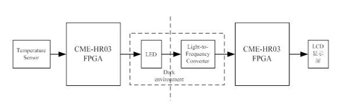 本系统主要包括CME-HR03 FPGA,温度传感器,光频转换器及LCD显示屏几个部分,其实现框图如下所示:
