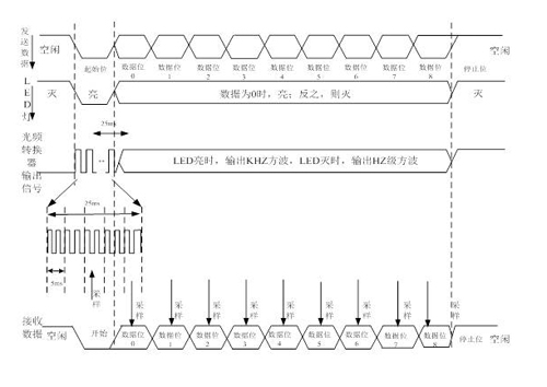 光频转换接收器可以接收的可见光波长范围为320nm~1050nm,该器件中含有一个光敏二极管和一个光频转换器,可将不同强度的可见光转换为占空比为50%的不同频率的方波。