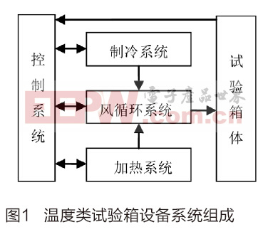 本文中的环境设备控制系统,主要面向温度类环境试验设备,如高温试验箱、高低温试验箱、冷热冲击试验箱、恒温恒湿箱、湿热箱等[2]。而温度类环境试验设备通常由主箱体、加热系统、制冷系统、风循环系统、主控制系统组成,如图1所示。