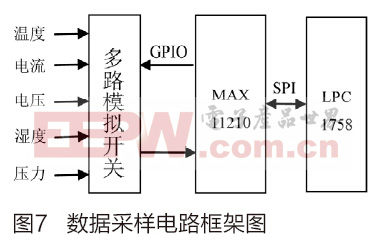 其中滤波采样电路中采用的Maxim的单通道24位ADC MAX11210。该ADC集成了模拟和参考输入缓冲放大器,并提供四个GPIO口,可用于控制一个外部16通道模拟开关,令MAX11210有效地对16通道的模拟信号进行采集,降低了LPC1758的I/O资源负担。采样电路框图如图7所示。