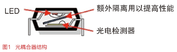 光耦合器利用光作为主要传输方法,如图1所示。 发送侧包括一个LED,高电平信号开启LED,低电平信号关闭LED。 接收侧利用光电检测器将接收到的光信号转换回电信号。 隔离由LED与光电检测器之间的塑封材料提供,但也可利用额外的隔离层(通常基于聚合物)予以增强。