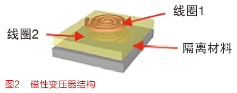 磁隔离器(基于变压器)已大规模应用十多年,是光耦合器的有效替代方案。这类隔离器基于标准CMOS技术,采用磁耦合传输方案,隔离层由聚酰亚胺或二氧化硅构成,如图2所示。以低电流脉冲方式通过线圈传输,产生一个磁场,磁场穿过隔离栅,在隔离栅另一侧的第二线圈中感生一个电流。 由于采用标准CMOS结构,其在功耗和速度方面具有明显优势,而且不存在光耦合器相关的寿命偏差问题。 此外,由于基于变压器的隔离器中存在较低的寄生电容,它们的CMTI性能优于基于光耦合器的隔离器。