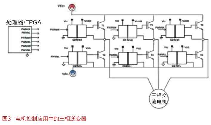 PWM信号(如PWMaH和PWMaL)在电机控制器(一般用处理器和/或FPGA实现)中产生。 这些信号一般是低压信号,参考处理器接地轨。为了正确开启和关闭功率晶体管,逻辑电平信号的电压电平和电流源能力必须放大,另外还必须进行电平转换,从而以相关功率晶体管发射极为接地基准。 根据处理器在系统中的位置,这些信号可能还需要安全绝缘。