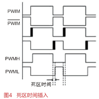功率晶体管有一个有限的开关时间,因此,高端和低端晶体管之间的脉宽调制波形中必须插入一个消隐或死区时间,如图4所示。 这是为了防止两个晶体管意外同时打开,引起高压直流总线短路,进而造成系统故障和/或损坏风险。 死区时间的长度由两个因素决定:晶体管开关时间和栅极驱动器传播延迟失配(包括失配的任何漂移)。换言之,死区时间必须考虑PWM信号从处理器到高端和低端栅极驱动器之间的晶体管栅极的任何传播时间差异。