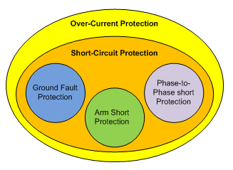 简单来说,短路保护是过电流保护的一部分。图1表示不同电流保护之间的关系。 接地故障保护、臂短保护和相间短保护都属于短路保护。