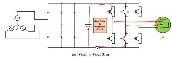 图2表示不同的短路模式和电流路径。如图2(a)所示,当电机绕组短接至电机壳体(通常接地)时,或者当电机电缆短接至接地时,则发生接地故障。图2(b)表示桥臂短路,指高侧IGBT和低侧IGBT同时意外导通并产生极高电流的情况。图2(c)表示相间短路,当不同相间的电机绕组短路时发生。所有三个示例中,电流幅度因电流路径(包括IGBT本身的)阻抗而受限。