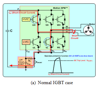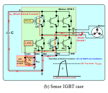另一方面,SCP侧重于IGBT故障。Fairchild SPM?智能功率模块中的IGBT具备卓越的短路性能,但如果不能在几微秒内安全关断,仍可能受损。因此,应配置延迟时间固定在几微妙的硬件,而非通过软件实现。保护IGBT免受短路损坏的最常见方法是通过电流检测电阻感测负直流总线电轨上的电流,如图4(a)所示,并将压降前馈至栅极驱动器,以便后者同时软关断IGBT。在短路条件下关断IGBT可能造成过大电压尖峰和闭锁故障。而软关断是克服这些问题最为有效的方法。对于额定功率高于5 Hp的变频器,电流检测电阻的选择相当有限,而Fairchild的SPM 2系列产品采用感测IGBT,其中配备感测发射极引脚,载流仅为实际发射极电流的一小部分。三个感测发射极相连,使电流通过外部电流检测电阻,如图4(b)所示。压降以相似的方法前馈至栅极驱动IC。