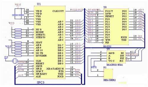 SPC3(SIEMENS PROFIBUS CONTROLLER)为优化的智能PROFIBUS-DP从站,集成有PROFIBUS-DP物理层的数据收发功能,可独立处理PROFIBUS-DP协议。SPC3的内部有RAM、方式寄存器、状态寄存器、中断寄存器以及各种缓冲器指针和缓冲区等。SPC3有8根数据线和11根地址线,其中8根数据线与地址线复用,可以接80C32、80C166、80C196、HC196等单片机。SPC3内部集成了1.5KB的双口RAM作为SPC3与软件/程序的接口,能自动调整9.6K到12M波特率。