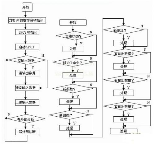 SPC3的初始化程序应放在主程序的前面,而中断处理程序完成CPU对SPC3中断输出的响应。SPC3上电复位之后。在正常工作之前必须进行初始化,以配置各个寄存器。中断处理程序用于处理SPC3发生的各种事件,这些事件包括新的参数报文事件:全局控制命令报文事件,进入或退出数据交换状态事件,新的配置报文事件,新的地址设置报文事件,监测到波特率事件和看门狗溢出事件。SPC3在接收到由PROFIBUS主站传送的不同输出数据时会产生输出标志位,CPU通过在应用循环中轮询标志位来进行接收主站数据。对于特定应用的诊断信息需要实时传递到主站。主应用程序在应用循环中判断是否有可用的诊断BUF存在一当有空闲BUF时应用程序输入诊断信息,并请求更新。对于实时性要求严格的系统,应采用中断方式进行输出数据和诊断数据处理。