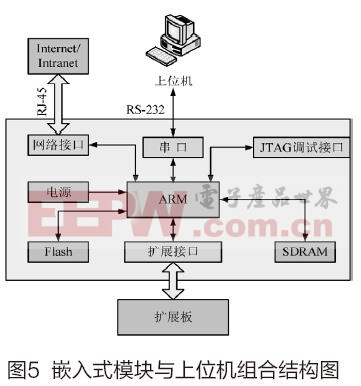 嵌入式ARM计算机综合处理由电液伺服机构仿真设备发来的各种操作信息,并进行分类处理,一方面将操作信息发送到外围设备处理模块,使各分电路工作协调一致,实现信息同步交流与共享;另一方面将处理信息上传到教学系统终端,进行多媒体教学互动和训练监控与管理,嵌入式ARM计算机模块与上位机的组合结构图如图5所示。外围模块主要完成各设备或仪器的功能仿真,既能独立工作,又通过总线结构,与通用计算机的进行信息交换,保证系统的同步协调。