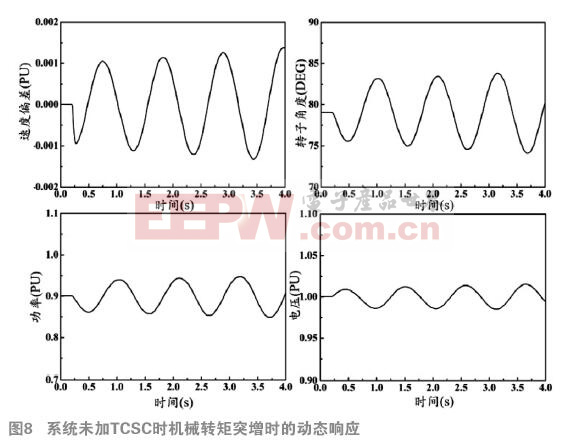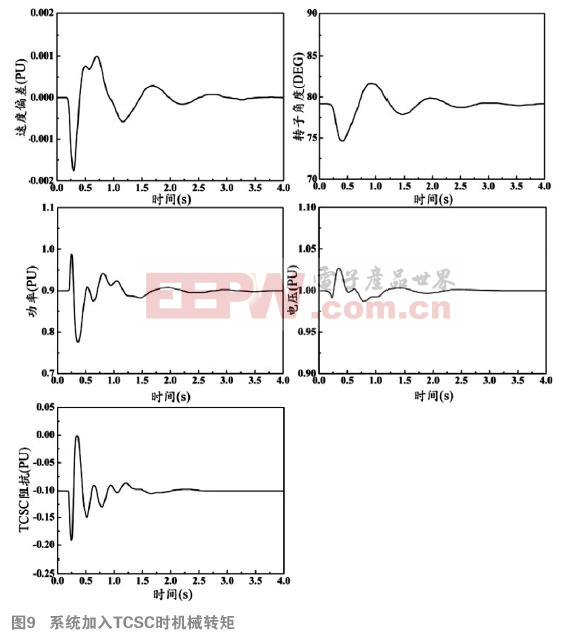 首先,机组在0.2 s时,突然有0.1 pu的机械转矩加入,持续100ms后恢复,未加TCSC前的动态响应如图6所示,系统状态不稳定;加入TCSC与设计的进相-迟相控制器后,系统的动态响应如图7所示,并于未加TCSC的动态响应进行对比,可以看出TCSC能够抑制机电模式低频振荡的效果。相反图8、图9为机组在0.2s时,突然降低0.1pu的机械转矩,持续100 ms后恢复,未加TCSC与加入TCSC与控制器后的系统动态响应图。可知不论机组在加速或减速扰动下,TCSC结合控制器均能有效抑制系统的低频振荡,提高系统的稳定度。