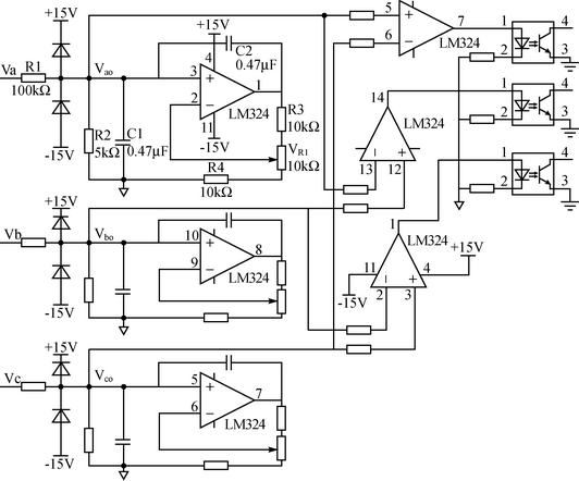 本设计采用方案包括3个分压电路、3个恒零相移滤波电路和3个线电压比较器,如图3所示。其特征在于3个分压电路分别由两个电阻R1、R2串联,其R1的一端作为输入端分别无刷直流电机的三相电机线连接,R2接地,R1、R2的连接点作为输出端,分别与相应线电压比较器的正确输入端连接;3个恒相移滤波电路分别由两个电阻R3、R4,两个电容C1、C2和一个集成运放构成。电容C1并连接于分压电路R2。电容C2的一端与运放的正输入端连接并与电容C1的一端连接,另一端与运放的负输入端连接。电阻R4的一端与运放的负输入端连接,另一端接地。3个线电压比较器的正输入端分别与相应分压电路的输出端连接,而负输入端分别与相邻分压电路的输出端连接。各线电压比较器的输出分别作为电机的换相信号。