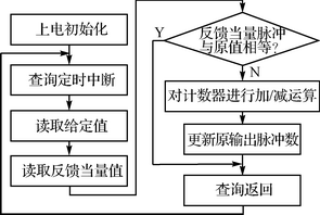 软件设计中初始化设置要定义各端口的功能,电机的初始化主要是运行前设置端口的I/O方向,确定所选择的细分驱动方式等。之后,要实时获得电机的工作状态和驱动电机运转,并在中断服务程序中处理电机的丢步和转向控制[6]。现代单片机运行速度都很快,所以对编码器采用软件鉴相,既简化电路结构,又节约成本。将编码器的A相与单片机的外部中断INT0相连,B相与普通I/O口的P1.0相连。由于编码器的A相与B相在输出上有固定的相位关系,正转与反转时编码器的A、B两相的电平信号不同,正转时,每当A相出现高电平的前四分之一周期时,B相为高电平;反转时,每当A相出现高电平的前四分之一周期时,B相为低电平。因此,单片机使用外部中断0来处理编码器数据,把编码器的A相接中断源。在中断服务程序中,程序通过读取B相(P1.0口)的状态来确定编码器的转向,进而完成加1或者减1的双向计数[7]。软件程序流程如图4所示。