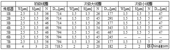 电感值主要与线圈材质和设计有关;同样地,磁场也与线圈设计有关。既然传感器行为与几何学参数紧密相关,为找到尽可能最好的配置,我们设计并制造了八个不同的传感器版图。这些芯片版图拥有相同的线圈匝数、线宽和间隔。这八个传感器分别叫做1B、2B、…8B。按照参考文献[22]列出的仿真结果,我们为所有传感器(8B除外)选定了线宽和间隔,以及次级大小线圈的位置。表1列出每个传感器的几何参数。为避免环境噪声,设计一个外部接地保护环路。