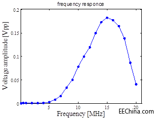 图5是测试结果。不难发现,次级大线圈的信号幅值与谐振频率大约15MHz的频率是函数关系。传感器表征选用这个频率。