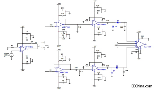 为表征电感式生物传感器,我们开发出一个适合的信号调理电子元件。为使电流值恒定,避免线圈电阻或电感变化引起峰流,我们采用振幅5Vpp、频率15MHz的正弦信号,通过电压-电流转换器驱动初级线圈。在退耦后,次级线圈信号经非反相放大器放大,提供信号修整所需的振幅。为保证极性绝对为正,放大信号通过钳位电路升压,然后被修正;使用钳位电路可取得更高的响应性能。最后,用一个差分放大器对两个被修整的信号进行放大和去除处理。图8所示是上面讨论的电子元件的机制