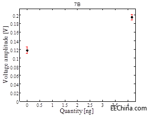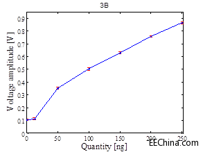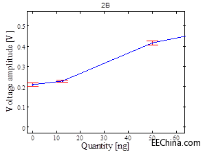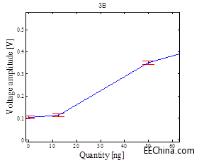 如前文所述,在八种生物传感器的表征实验中,次级大小线圈均被测试。即使八种传感器的响应性、分辨率、不确定性等参数都被测量,因为数据合成的原因,这里只能提供部分实验性表征。图11列出了在次级大线圈上取得的实验数据以及误差柱状图(@ 3sigma),不难看出,输出信号电压随着磁珠质量增加而升高。本图只描述了2B和3B两个传感器的行为特性。