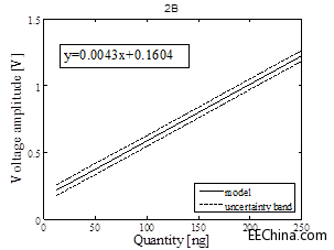 因此,在12.5ng以下工作范围,感测系统必须使用次级小线圈;次级大线圈用于磁珠质量大于12.5ng的情况。然后,计算出次级大线圈感测系统的模型,不包括磁珠质量小于12.5的情况。图13所示是2B和3B传感器的线性模型以及不确定性范围;图中还有模型方程式。