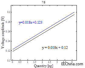 图14表明,次级小线圈能够发现并测量质量太小而次级大线圈无法测量的磁珠。另一方面,次级小线圈工作面小,少量的磁珠就能占满全部工作区,使其趋于饱和,故不能测量大质量磁珠。为表征次级小线圈与磁珠质量保持函数关系的行为特性,如前文所述,实验采用了多种不同质量的稀溶液,只有传感器7B采用了四种质量的磁珠,其行为特性见图15。