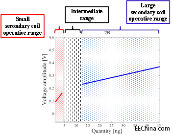 4.16ng(即次级小线圈的最大检测值)和12.5ng(即次级大线圈的最小检测值)之间是中间带。在这个范围内,如果使用次级小线圈,传感器线性不好;如果使用次级大线圈感测,传感器响应性不好,考虑到这两点,不妨将两个感测系统同时使用。