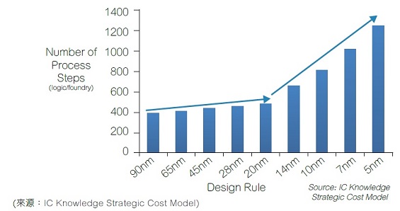 图2 制程步骤从16/14纳米节点开始随设计规则微缩而急遽增加。