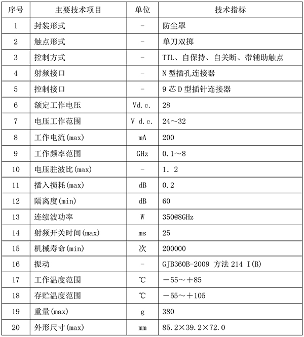 机载大功率射频同轴继电器主要技术指标见表1。产品特点是驱动电流小,功耗低、振动等级高、耐大功率。
