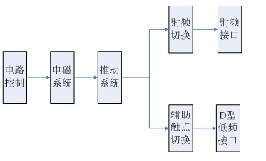 机载大功率射频同轴继电器主要由电路控制、电磁系统、推动系统、射频切换、射频接口、辅助触点切换、D型低频接口七部分组成。产品结构图见图1,工作原理框图见图2。