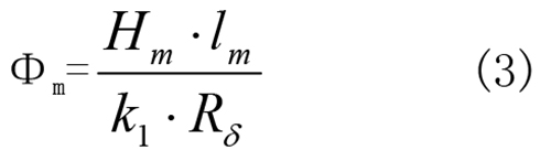 式(3)中:Hm导磁体中的磁场强度,由磁钢的去磁曲线求得,lm为磁钢的长度,k1为修正系数,Rδ为气隙磁阻,μ0为真空磁导系数,S为极靴面积。