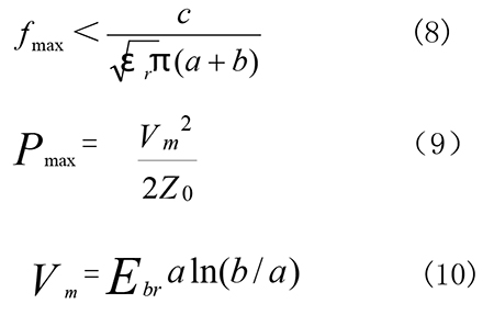 式(8)、(9)、(10)、中:为同轴线传输的最高频率;为同轴线最大传输功率;Vm为同轴线行波峰值电压;c为光速3×108米/秒,;Z0为特性阻抗;Ebr为介质击穿场强。