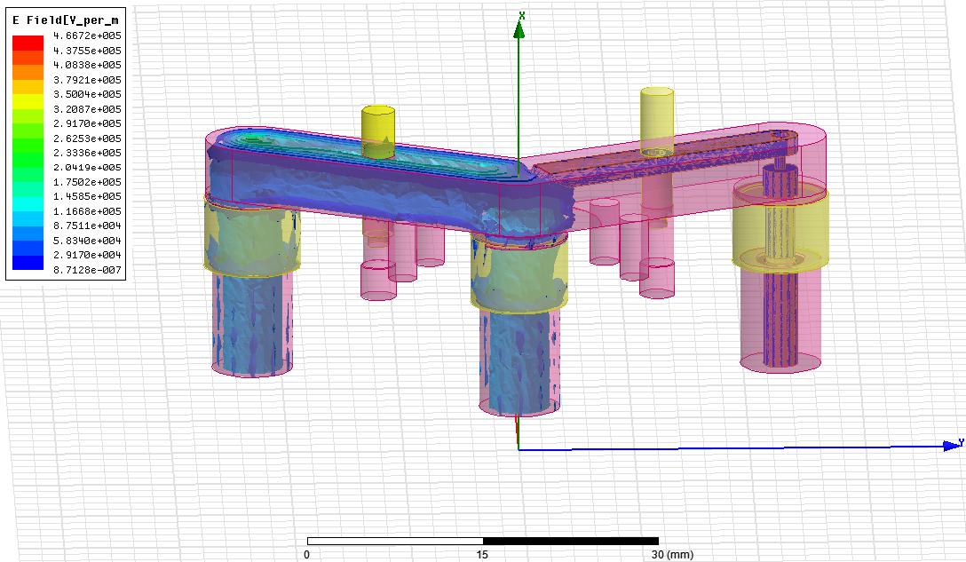 在初步确定相关尺寸后,进行建模,见图8,采用HFSS软件对射频传输线进行电场仿真验证,射频输入端口输入350W@8GHz功率信号,电场分布图见图9。