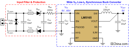 输入滤波器和保护 宽 VIN 低 IQ 同步降压型转换器