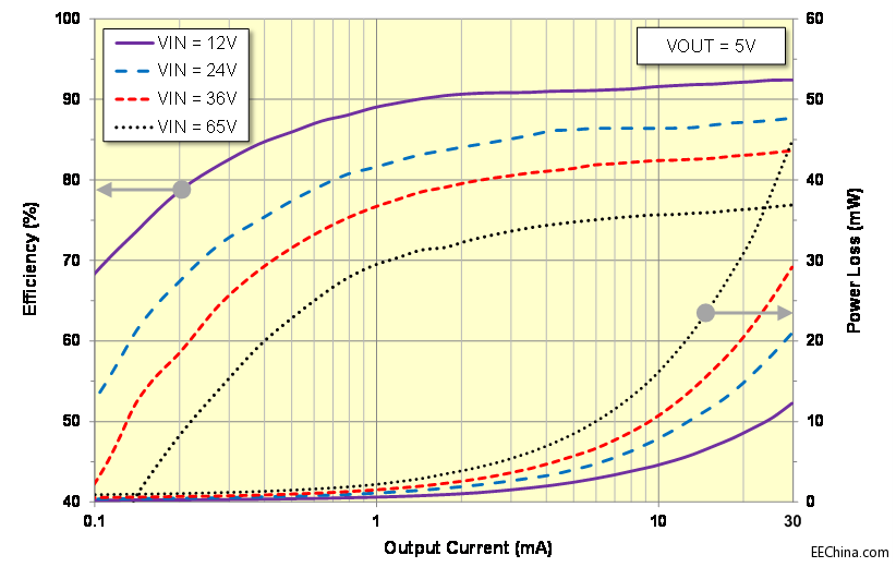 LM5165 中内置的面向智能传感器应用的各种特性包括一种用于实现最佳解决方案尺寸的简单控制架构、用于提供低压差的 100% 占空比能力、一个用于电源轨排序和故障报告的漏极开路电源良好指示电路、在内部固定或从外部可调的软起动 (SS)、以及具有可定制迟滞以提供可编程线路欠压闭锁 (UVLO) 功能的高精度启用。而且,一种可调的逐周期电流限制优化了电感器选择和尺寸。图 3 显示出了对于 0.1mA 至 30mA 负载电流的转换器效率和功率耗散。