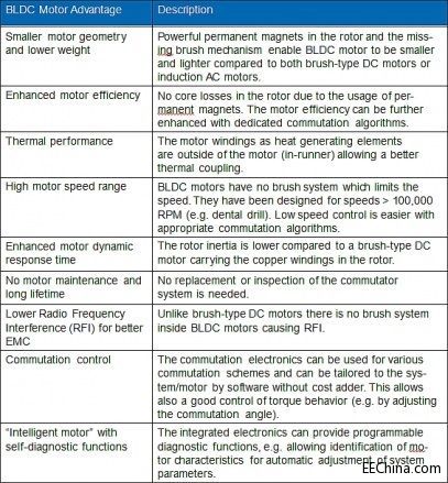 与其它电机技术相比,BLDC电机有若干优势,总列在表1。