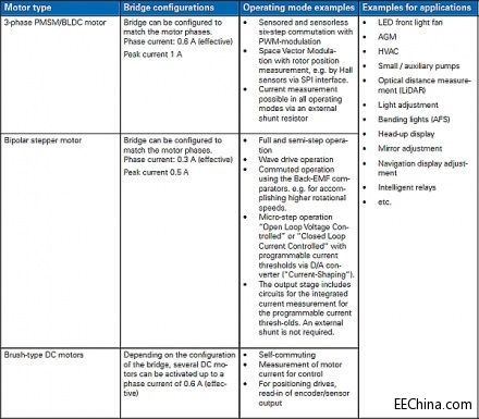 采用BLDC电机技术的市场在扩大。诸如燃料或水泵、空调(采暖通风和空调)、曲面光、大灯调平及许多其它汽车功能,正在从有刷直流电机或步进电机技术转为BLDC电机技术。当然,这不能一般性地证明有刷直流电机或步进电机都将被BLDC电机技术取代。但电机控制电子与电机本身相比,太过昂贵这个主要论点,正一天天失去说服力。此外,BLDC电机的优点可以显著强化其它系统属性(见表1)。因此,可以预见向智能运动控制这样一个变革终将到来。