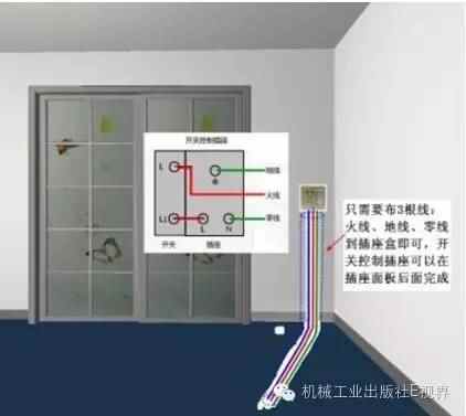 开关控制插座的实际应用如图18所示。该例子是开关控制插座的洗衣机插座布管布线。由于开关控制插座的连线在插座与开关间实现连接,因此插座外接只需要三根线即可。最终效果图如图19所示。
