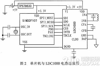 墙体电线便携式检测仪工作的核心是正确检测到电线的位置所在,本系统的主要设计工作在于LDC电感数字传感器的设计。用STM32F107的SPI口与LDC1000相连,完成金属位置的检测。具体连接如图2所示。