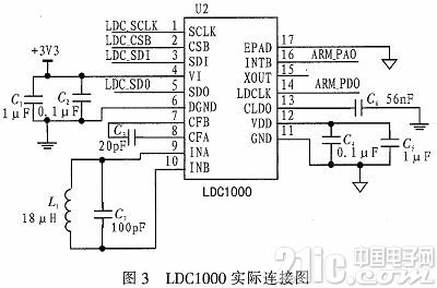 在图2中,由锂电池供应+5 V电压,直接向LDC1000供+5 V电压,经TPS78633向STM32F107和LDC1000供应+3.3 V电压。采用STM32F107的SPI1与LDC相连,实现对LDC1000的控制。单片机的SHI1_MOSI、SPI1_MISO与LDC1000的数据输出SDO、数据输入SDI进行数据交互,完成测量。单片机的SPI1_SCK提供LDC需要的时钟信号。PD0与LDC1000的CSB相连,作为从设备使能端口。PA0与INTB相连,作为中断输入接口。TM2_CH2与LDC1000的TBCLK相连,作为频率计数。LDC1000实际连接图如图3所示。