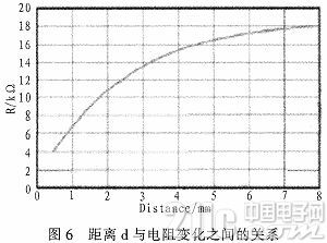 合理设置LDC1000的RpMAx和RpMIN寄存器的值,让Rp的实际值落在测量范围内,又保证足够的精度。可以通过实际测量的方法在极限的条件下测出Rp等效的最大值和最小值。将金属物体放在离线圈最近的位置,此时涡流损坏最大,得到Rp的最大值。将金属物体放在离线圈最远的有效距离,此时涡流最小,得到Rp的最小值。同时得到金属物体距离与电阻变化的曲线图如图6所示。