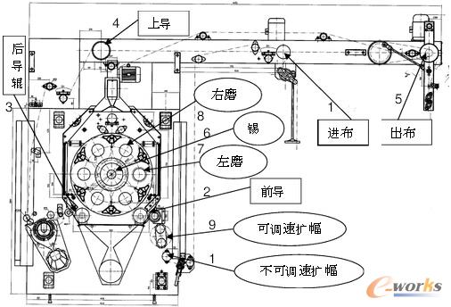(6)锡林(7)左磨辊(8)右磨辊(9)可调速扩幅辊(10)不可调速扩幅辊